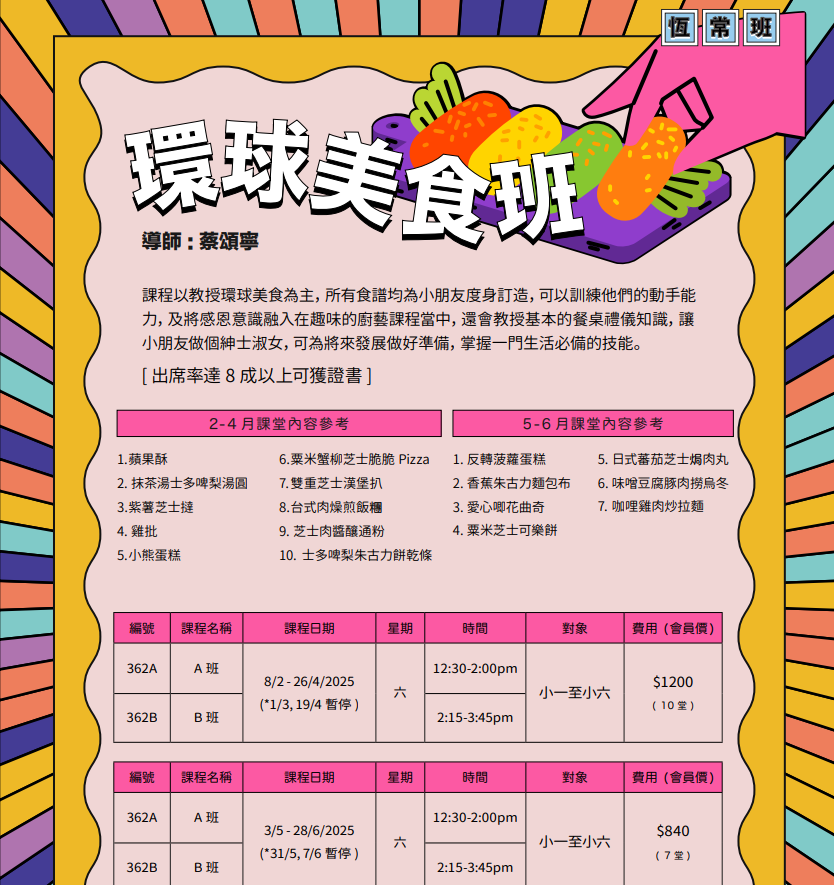 透過教授環球美食訓練小朋友的動手能力,及將感恩意識融入在趣味的廚藝課程當中,還會學習基本的餐桌禮儀知識,讓小朋友做個紳士淑女,可為將來發展做好準備,掌握一門生活必備的技能。