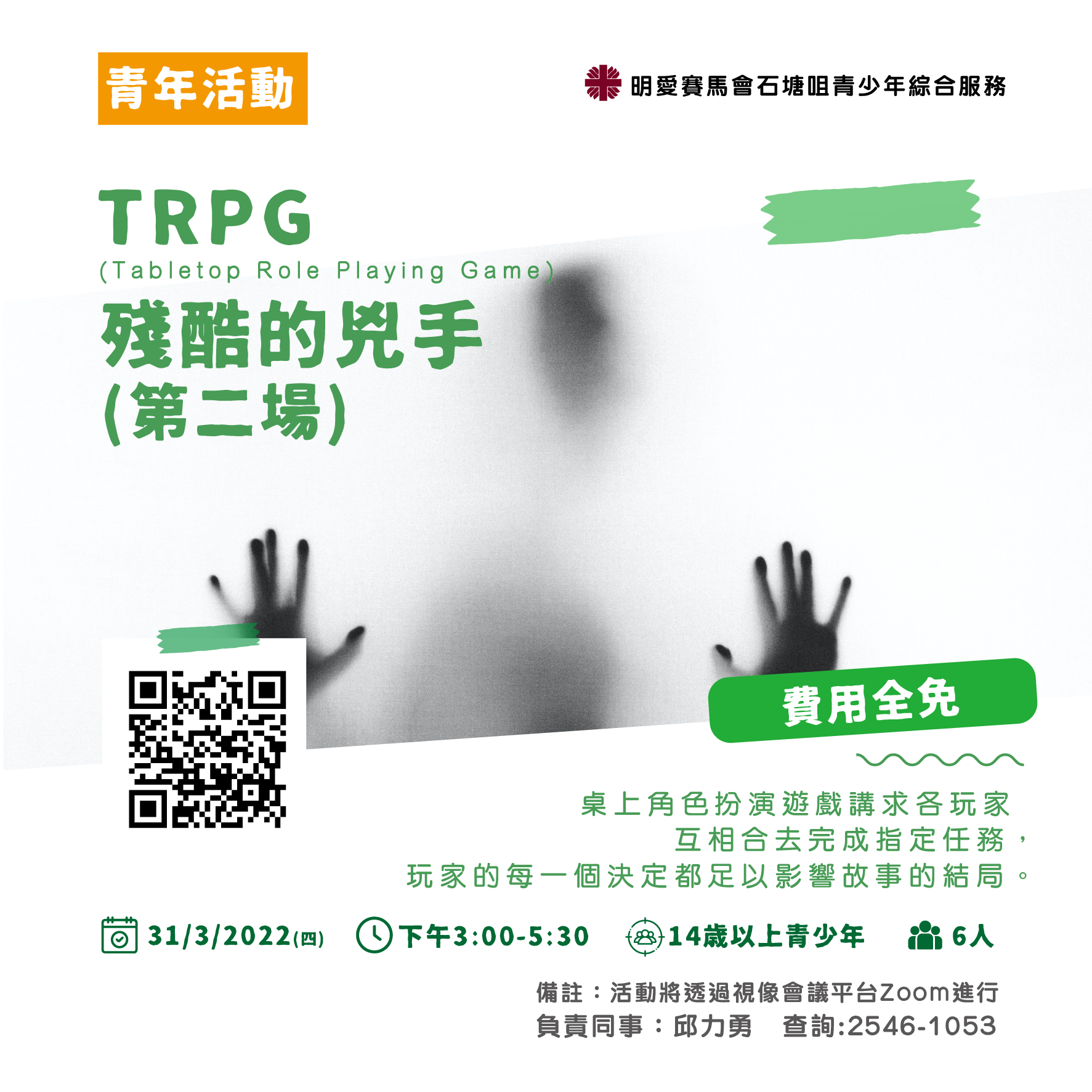 TRPG(Tabletop Role Playing Game)桌上角色扮演遊戲講求各玩家互相合去完成指定任務,玩家的每一個決定都足以影響故事的結局。 故事內容:在二十世紀八十年代的美國,某一小鎮在五個月內發生五宗連環殺人事件,五個青年人都被兇手用超殘酷的手法殺害。你作為一位直屬於美國總統,專為調查超自然事件而成立的特殊小隊(S.M.U.)的成員,奉命調查該事件,究境誰是這個『殘酷的兇手』呢?